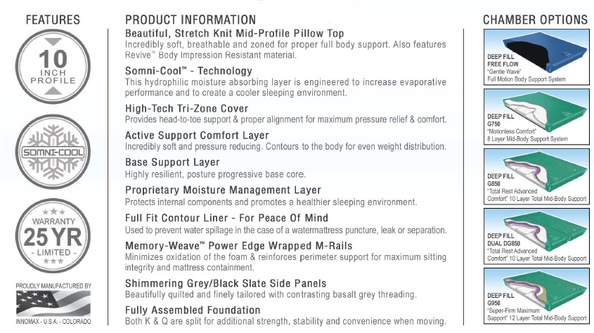 The pressure relieving Majestic mattress with it’s Frame Free Euro design is the ideal choice for the consumer who understands the benefits of a waterbed with it’s temperature controlled fluid support, yet seeks to move toward a more conventional looking mattress. The Frame Free Euro design eliminates hard to enter and exit traditional wood frame (waterbed) designs! Featuring a beautiful, stretch knit pillow top featuring a Tri-Zone cover for maximum pressure relief & comfort, Somni-Cool technology, Memory Weave wrapped Power Edge support and shimmering grey/black slate side panels. Select from a complete line of support chambers – most featuring “Total Body Support” for maximum orthopedic spinal alignment. 5 premium water mattress chambers to choose from!