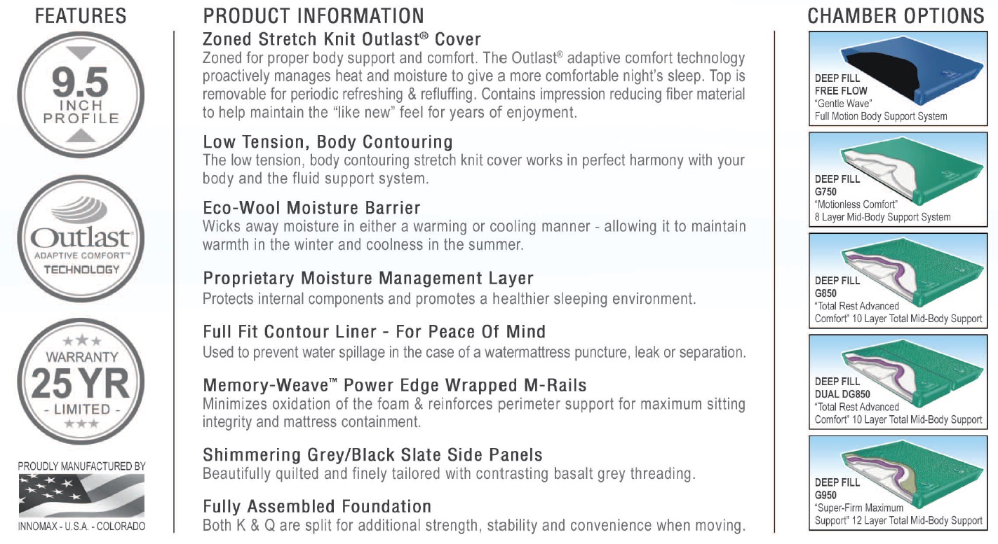 Featuring a stretch knit Outlast cover that manages heat & moisture for a more comfortable night’s sleep. The cover is zoned for proper body support and comfort. Also features an Eco-Wool Moisture Barrier for temperature management, Memory Weave Power Edge Wrapped M-Rails and shimmering grey/black slate side panels. Select from a complete line of support chambers – most featuring “Total Body Support” for maximum orthopedic spinal alignment. 5 premium water mattress chambers to choose from!